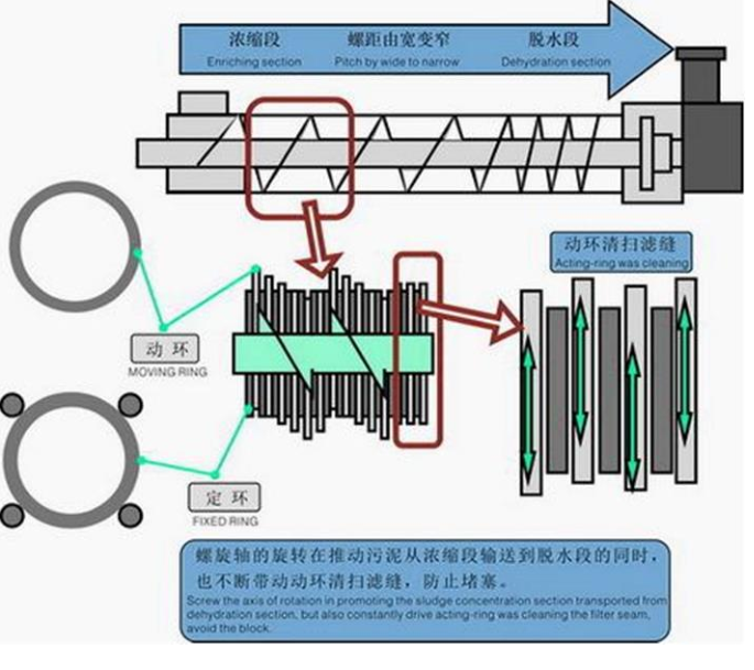 3、自清洗:螺旋軸的旋轉,推動游動環(huán)不斷轉動,設備依靠固定環(huán)和游動環(huán)之間的移動實現連續(xù)的自清洗過程,從而巧妙地避免了傳統脫水機普遍存在的堵塞問題。